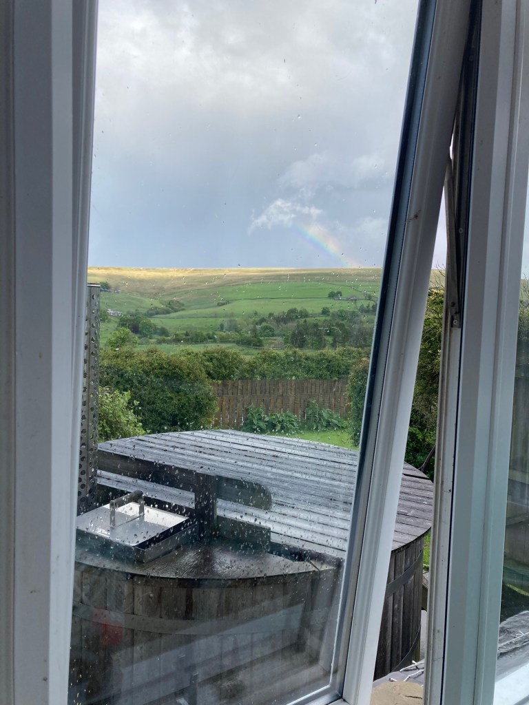 So I was sitting quietly in the conservatory as the raindrops pitter-pattered down, but when I glanced up the rainbow fragment was just there on the horizon. Had I not looked up, just then, I’d have missed it. Life goes on all around us, and sometimes we’re just lucky to catch up with it, to examine it as it moves along at pace. Too often we sense only the mundane when the magnificent is there for the seeing.