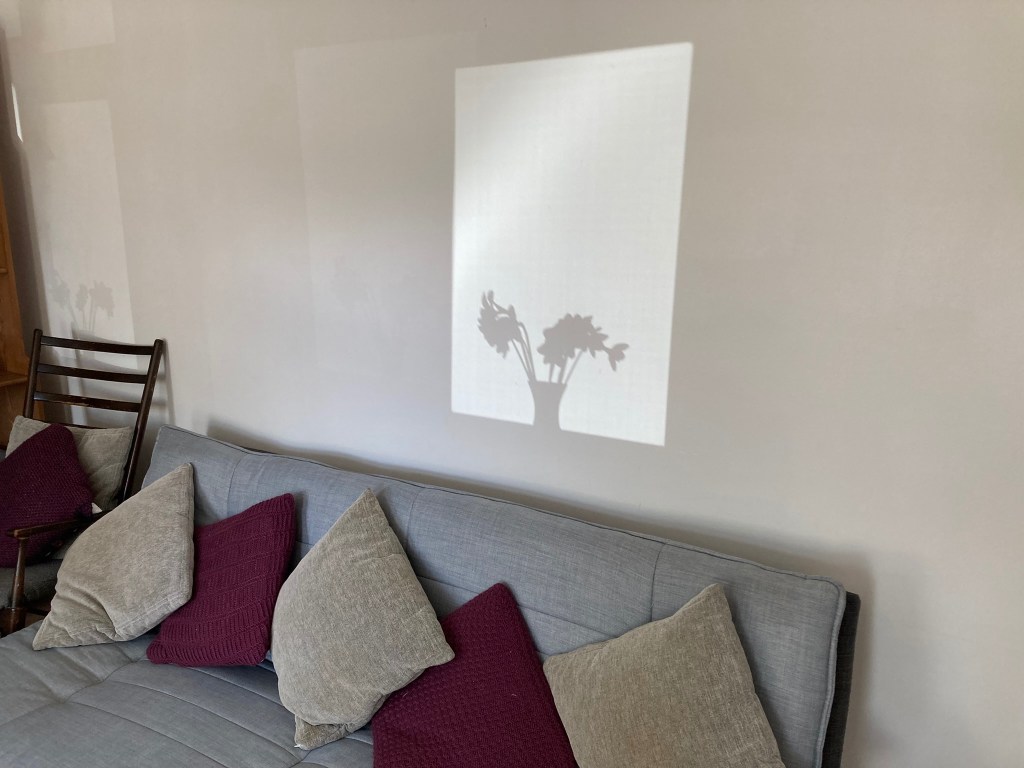 I confess that I’m not very good at this sort of reveal. I tend to write more directly, describing what I can. Indeed, I’m usually unaware of an author’s efforts to describe their characters in this way, absorbing the story and the ambience, the interactions, just as the writing flows. But in my stimulus image this morning, the reveal, the presence of the vase of flowers in the window, is indicated by the fact that we know they’re there because of the absence of light. It’s the shadow that creates the image.