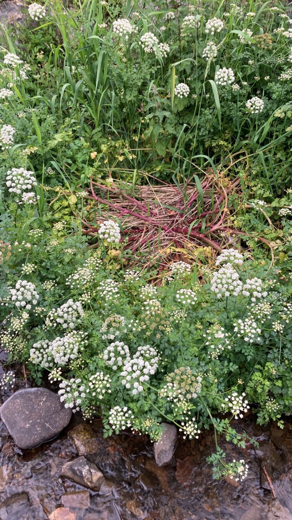 Today I’m thinking about the most poisonous plant in these isles, the hemlock water dropwort, or dead man’s fingers as the plant is commonly known. Apparently common along waterways, the plant could, if wild food gatherers confuse it with sweet parsley, be mistaken for an edible item. But the gatherers must beware — though the root tastes a bit like parsnip when first chewed, it can kill within a couple of hours of ingestion.