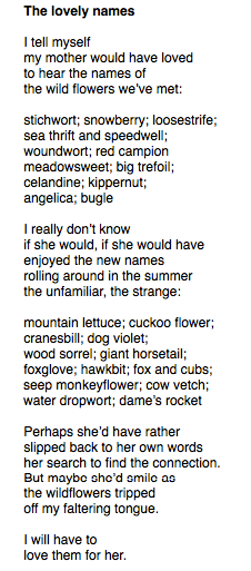 The lovely names I tell myself my mother would have loved to hear the names of the wild flowers we’ve met: stichwort; snowberry; loosestrife; sea thrift and speedwell; woundwort; red campion meadowsweet; big trefoil; celandine; kippernut; angelica; bugle I really don’t know if she would, if she would have enjoyed the new names rolling around in the summer the unfamiliar, the strange: mountain lettuce; cuckoo flower; cranesbill; dog violet; wood sorrel; giant horsetail; foxglove; hawkbit; fox and cubs; seep monkeyflower; cow vetch; water dropwort; dame’s rocket Perhaps she’d have rather slipped back to her own words her search to find the connection. But maybe she’d smile as the wildflowers tripped off my faltering tongue. I will have to love them for her.