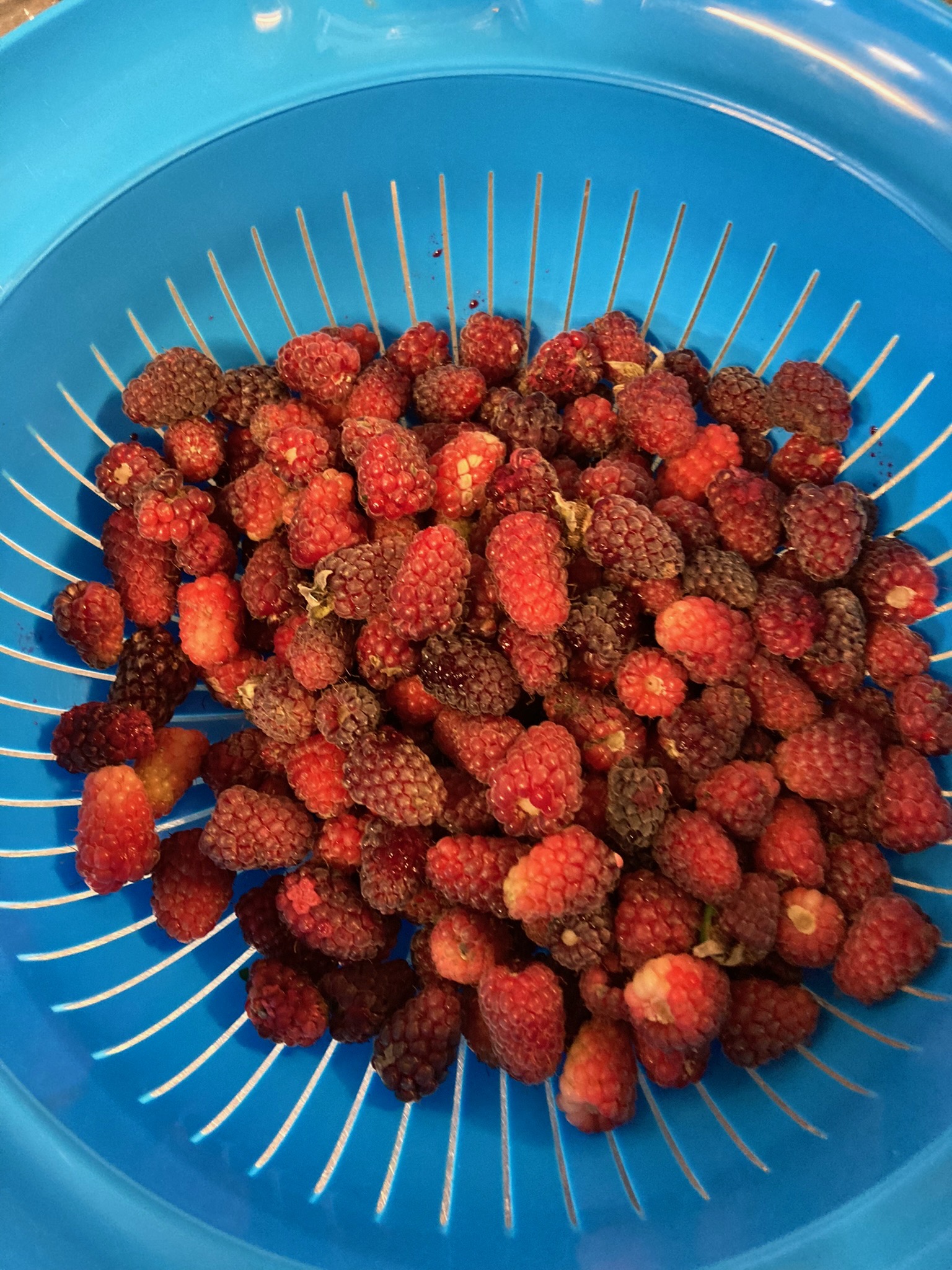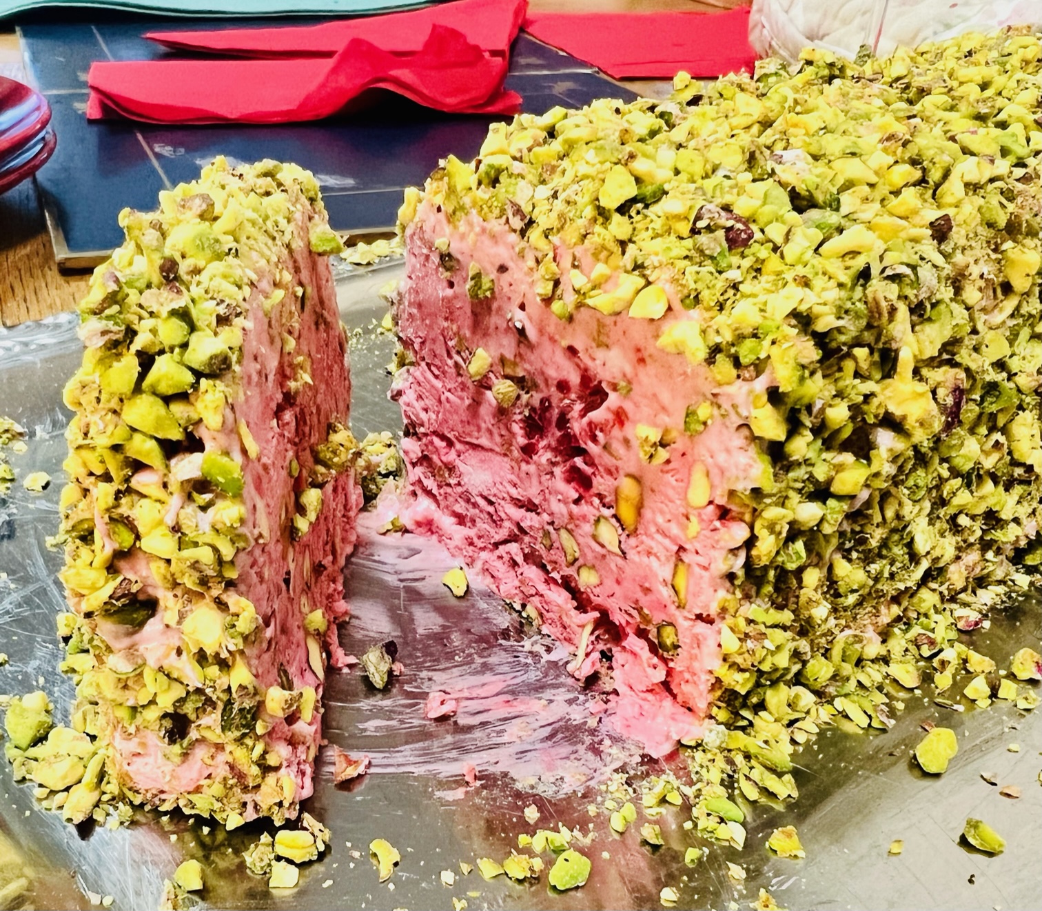 And then it was time for pudding! After the fresh vegetables harvested from our gardens, it was a special kind of joy to indulge in a new loganberry parfait, created for the occasion by our excited daughter. Covered in a crunchy pistachio topping, the parfait inside was perfectly unctuous, as they love to say on MasterChef.