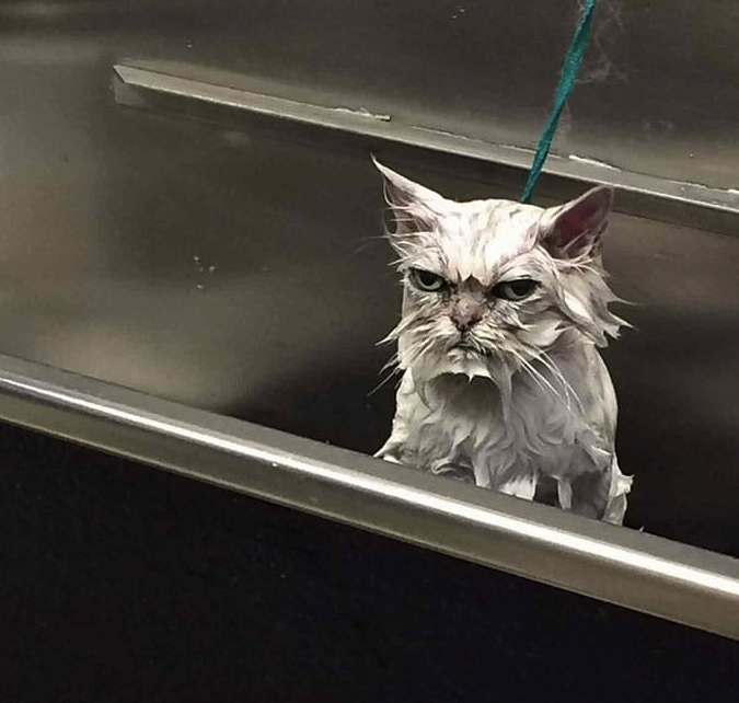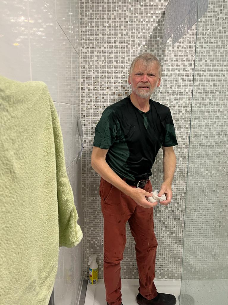 Whoops! Turned the shower tap in the wrong direction, so got completely drenched full in the face from the sideways shower head, instead of merely dodging the top head that I’d expected to rain down from above. My beloved wondered what the commotion was, and when she clocked the damage, immediately dashed out to fetch her phone, returning to capture me in full-blown frustration (or rather, as our daughter opined, in wet angry cat mode). The snap was taken just after I’d had to force myself back through the flow to turn the thing off, which felt like a return to ignominy.