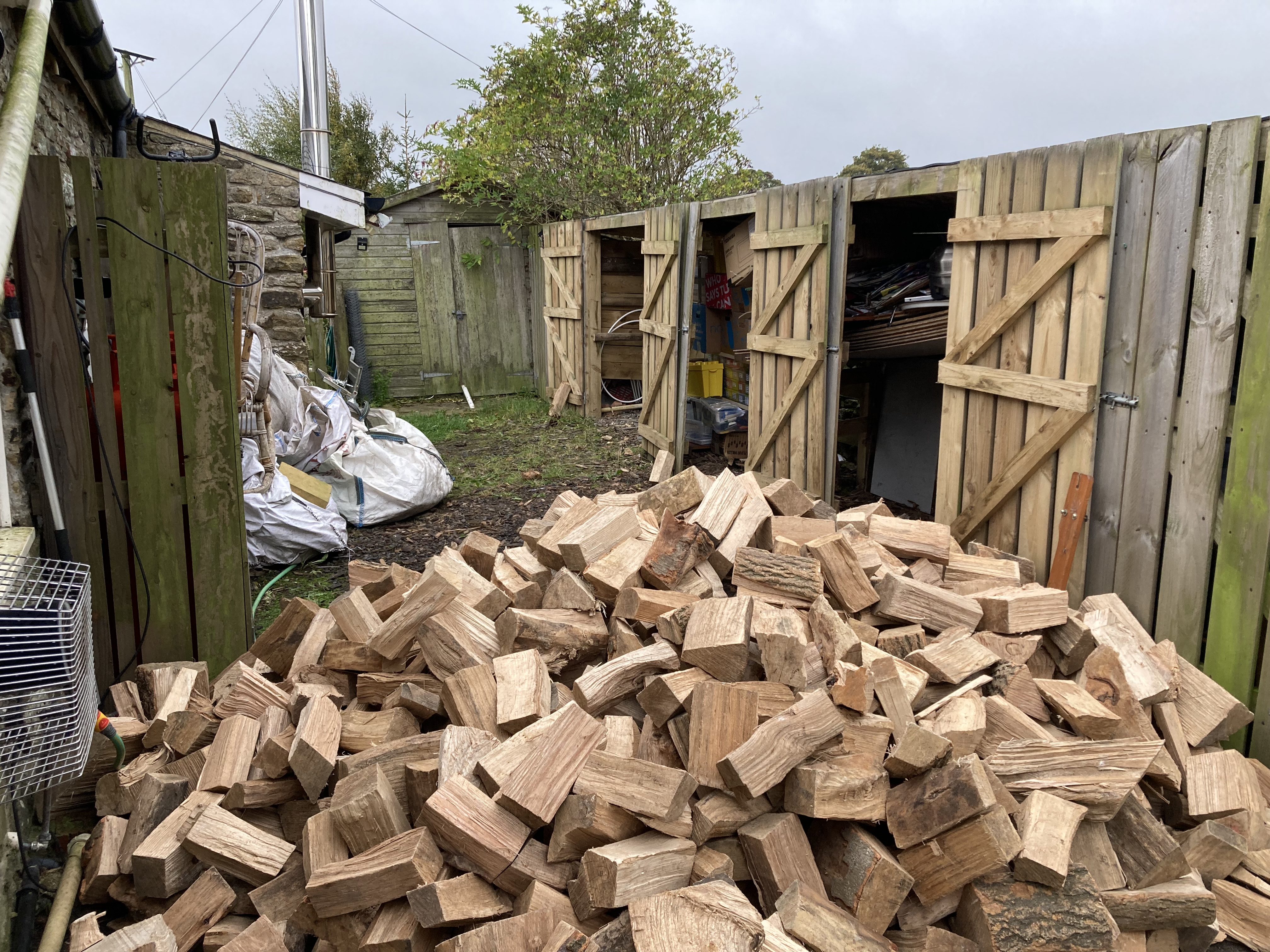 It took an hour and a half, or thereabouts (I had a breathing break two-thirds of the way through, before I exhausted myself) to get the pieces neatly stacked in two sheds.