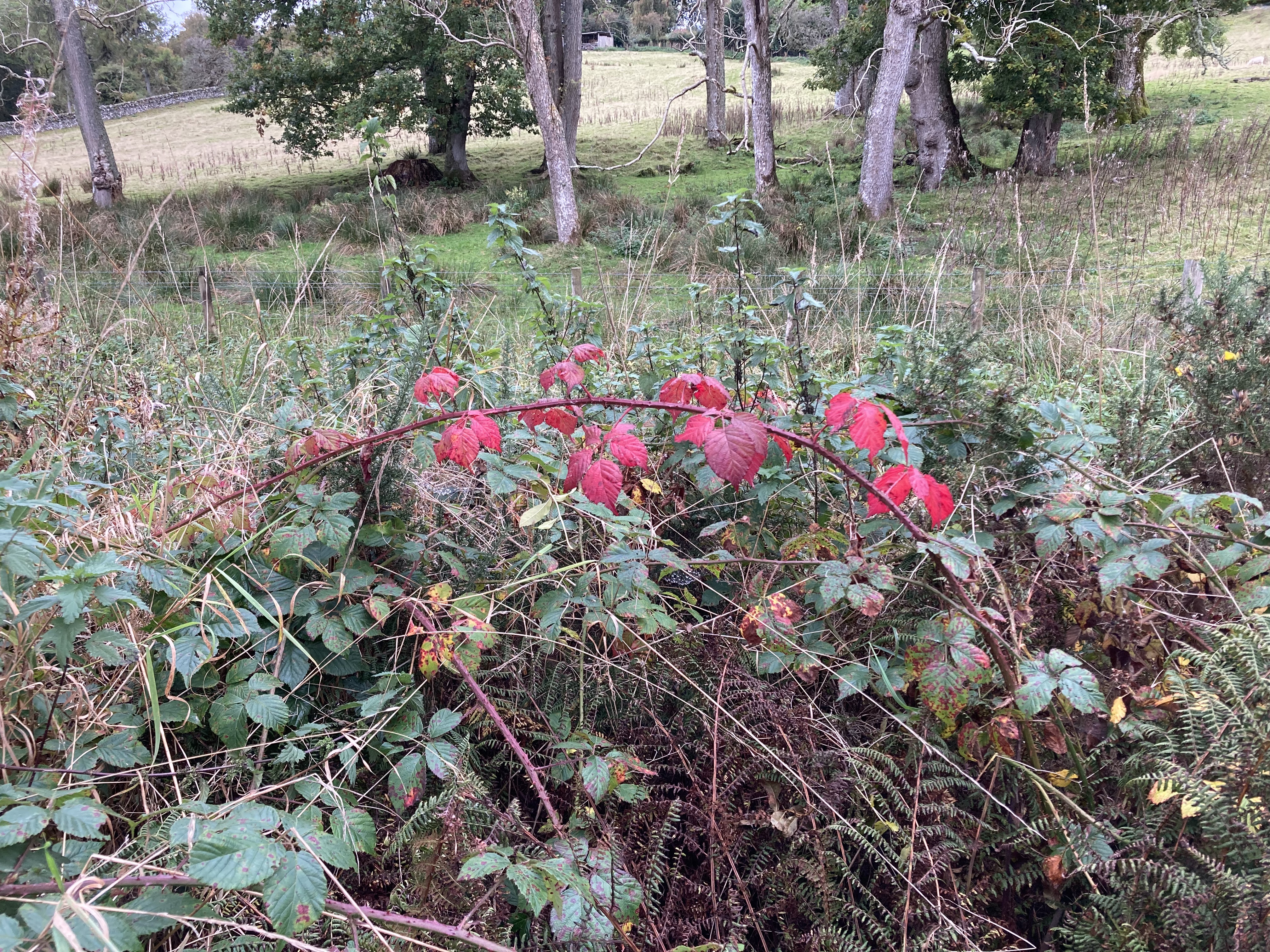 Anyway, here in the Glen Kens, it’s the blackberry’s turn to shine, and startle it certainly does. Why, we wondered, do entire branches of the plant decide to turn crimson all at once, while their neighbour stays green? We’ll have to watch the huge blackberry jungle, over the next while, to see how the autumnal change affects the population as a whole. Perhaps it’s something to do with exposure: the turned leaves are, after all, on branches that arch proud out of the patch.