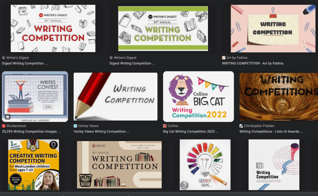 I participated in an annual competition, at the end of my first year in our local writing group. I entered a piece in every one of the 10 categories proffered by the National Association of Writers and Groups. I worked hard to hone each piece, to adhere to the rules, and to submit my entries in a timely fashion. I waited with increasing excitement for the announcement of the short lists. And then I was so dismayed to receive what I thought of as a single paltry Honourable Mention (I think the designation was Highly Commended, but the feeling was the same) for one of my efforts. Not even within scratching distance of a short list!