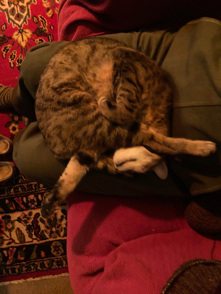 Some folks look forward to their New Year’s dip in the freezing North Sea, but having once subjected my body to the shocking needle-like experience of rolling in the snow after a hot soak, I’m not eager to try that again! No, I’ll be happy for a bit of intense warmth. We’ve been having just that of an evening, with the cat curled up in one or other of our laps. Quiet comfort with the wood fire blazing away.