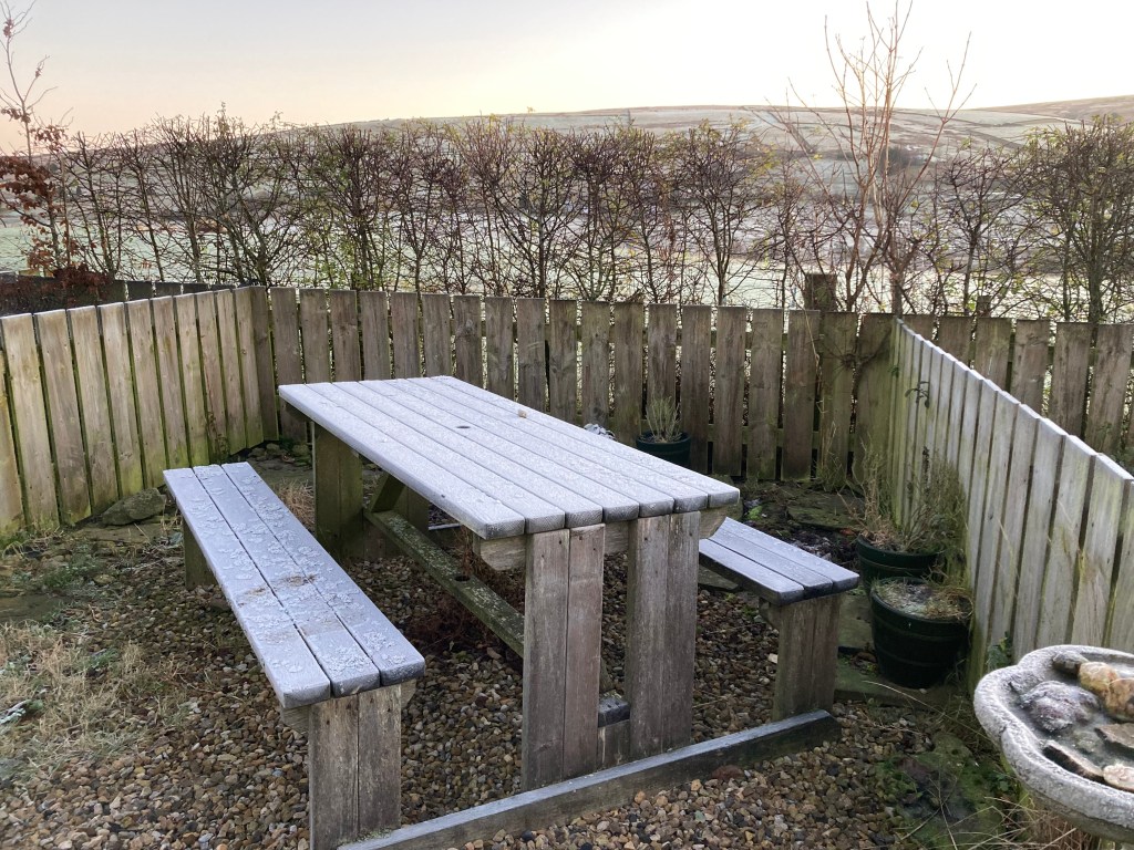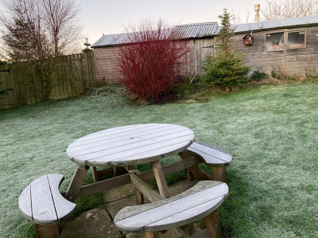 I guess my joy this morning has to do with feelings and contrasting senses. The feeling of the frosty morning as I venture forth in my dressing gown to capture the images that delight. The crunch of the frozen picnic bench under my slippers. The anticipation of the warmth of the hot tub, or the cosy ambience of the fire in the living room.