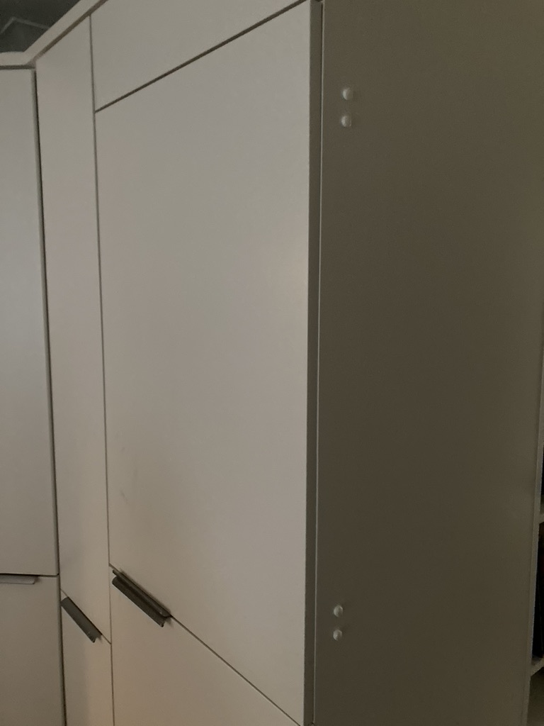 The problem with this strategy, however, was the potential unsightliness of the fixing on the smooth melamine finish. Another challenge was the chipboard holes created by the sagging screws. The solutions (plastic button lids; hardwood dowelling) were clear to me, but the job was going to need to be developed over several stages.