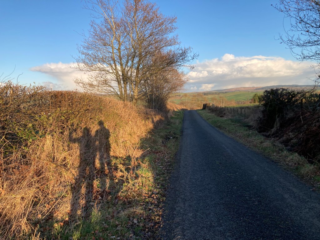 We’ve three walks, maybe four, that we enjoy from outside our front door. We could venture out onto the dyke wall that runs around the marshland along Ken Water. We could amble up past the golf course to a patch of ancient woodland and enjoy the soft moss-covered ambience there. But sometimes it’s the walk itself, of sufficient briskness, that compels, and that’s when a deserted road is best.