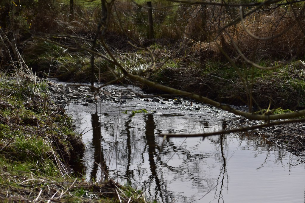 Return Visit — The Circuit: moving toward the gate sunshine and shadow cockerel crows big camera safely stowed in large jacket pocket tweety birds crows crack, pigeons coo red kite twirls overhead . . . is that its cry? stopping for a snap . . . piercing frisson past the storm sample point water rushing ripply ripples 1 ‘missed’ brown glass bottle bottom, embedded in the dry mud dazzling sunshine on moving water the sheep in the field are gone tall brown grasses emerging green nettles still, shallow, stagnant water wind-bashed marsh grass skip clangs to the ground far away discarded tissue, or [charitably] fallen from pocket ancient rusting gate distant windmills, white against the blue sky dark branches arch over drying, green-edged path piercing bird tweet followed by a bit chatter bumbler buzzes about gorgeous sky of blue and white I placed that rail beside the track, earlier! a distant bird conversation traffic, dull roar around the far bend on the dyke the buds are further out . . . green bits of leaves tiny white feather classic countryside sight: black hay bale wrapping festoons on the fence wire bones of a small deer; leg and hooves; fur tumbled down trees by Ken Water, onto dyke wall three circling red kites alternating fence posts pick up electrical top wire chilly breeze makes frozen fingers a dog is following us; takes diagonal to river excavations in the fieldside bank is one going through? 2 gate traverse within the colonnade of fences was the flood water to the top of the fence? the board walk appears . . . mind the gap the overhanging trees have been sawed off kissing gate children’s play circus tent on its side mouldering tyres on rusting wheels back of the estate wooden gabions washed away path beneath drain cover truck graveyard cooing pigeons welcome us back