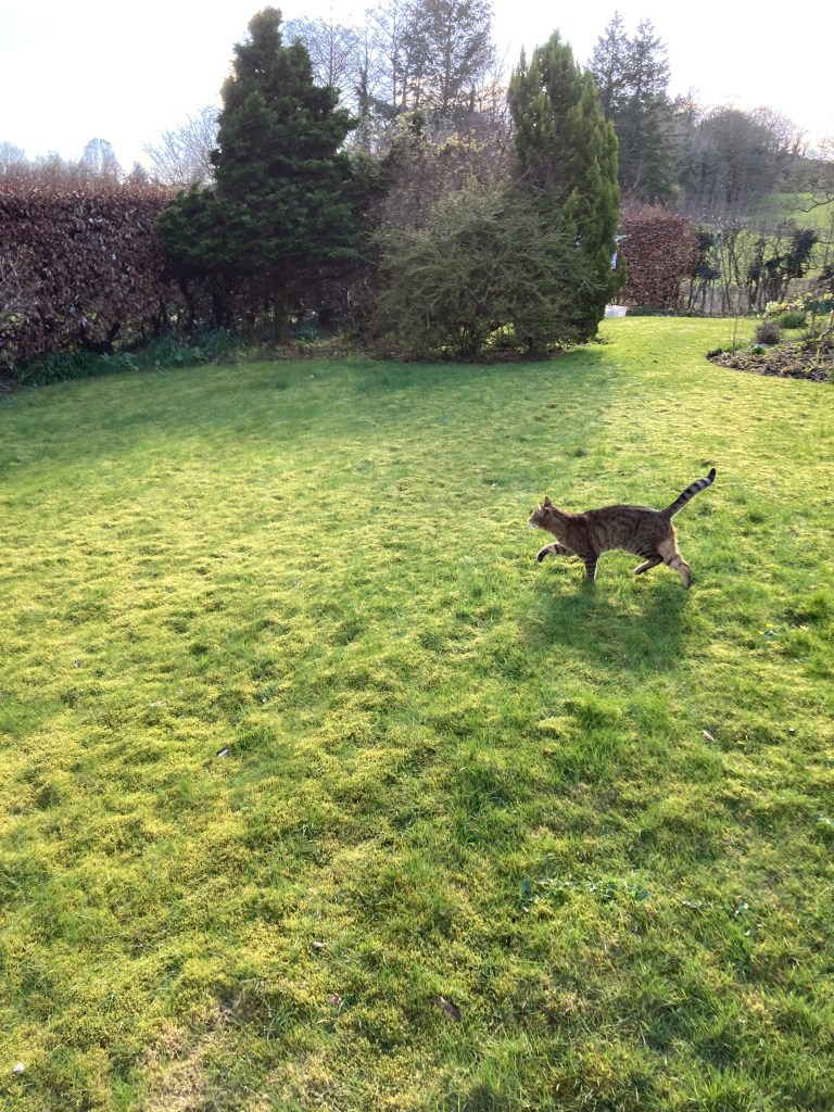 Freedom is its own reward, of course, but with it comes risk, and possible danger. We’re not set back so far from the road as we used to be, and though Kali had once had road sense, that surely has long passed into oblivion during her lifetime up in the North Pennine moorlands. Too, there’s danger of another kind: will the flitting little birds that enjoy the feeders hung so close to the house, right beside the garden benches, be safe from cat predation? Their wing throbs are so close to our heads that they seem to thrum as they pass by. We hope we’re not exchanging one kind of joy for another, accompanied by some sort of sadness.