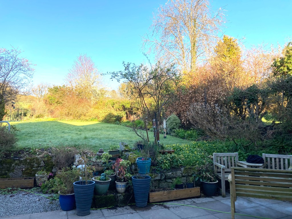 Our new-to-us garden faces west, so that the sun rising in the east illumines the space beyond the shade of the two extension peaks. I’m sure that there must be a quiet haiku to develop, as a kind of textual representation of the early morning scene before me.