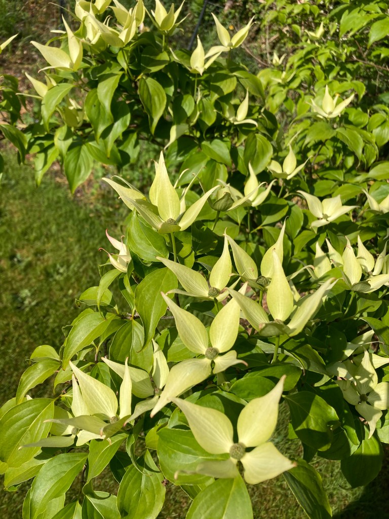 The Korean dogwood tree, at the bottom (or top, if you consider the gentle rise from the house back up towards the field) of our new-to-us garden, is in full bloom.