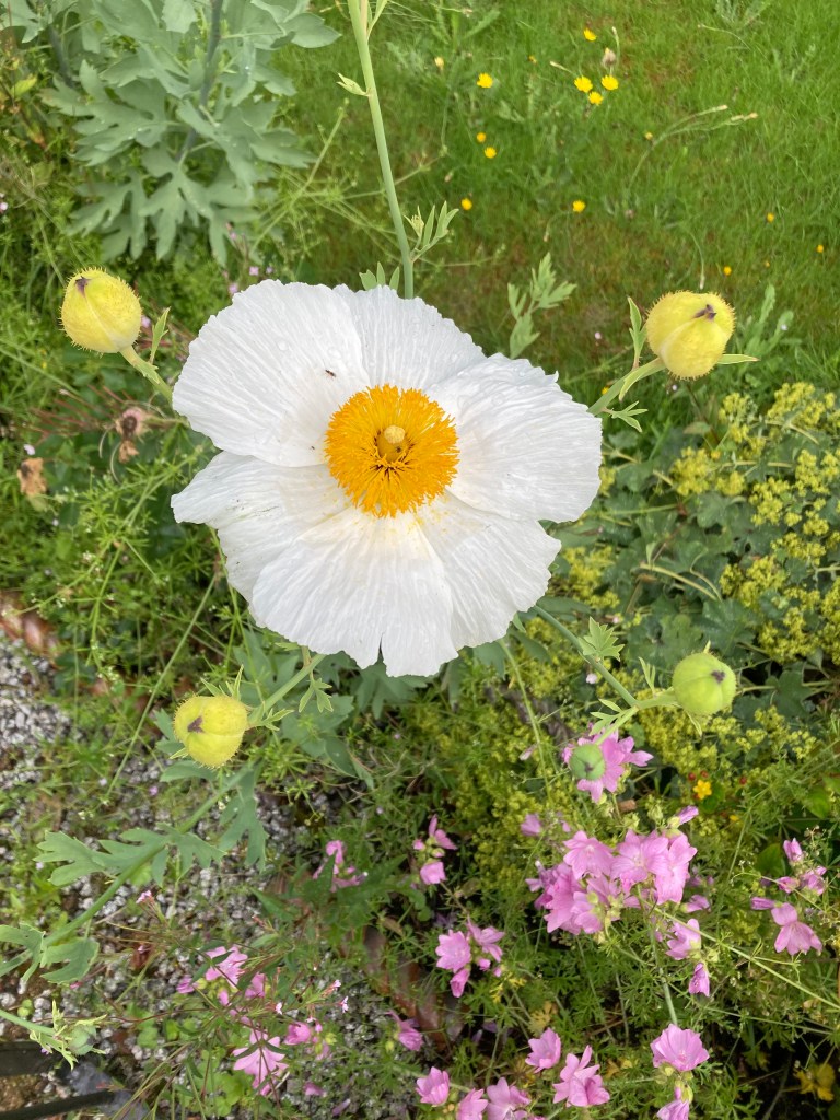 We’ve been waiting weeks for the giant poppies in our new-to-us front garden to bloom. These plants are just about taller than we are! Three have opened all at once, in the past couple of days, and it’s been worth the wait. There’s lots more on the way, too.