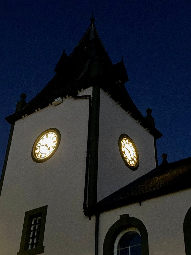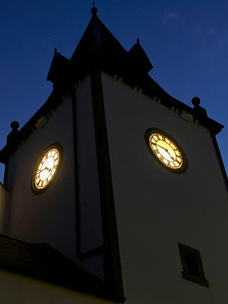 I had a little epiphany yesterday late afternoon, as darkness fell. As you walk down the road towards New Galloway’s Town Hall, you can see two clock faces, and they’ve been lit since the clock was repaired. Before that happy event, I was up in the tower helping to clear countless years worth of jackdaw nests, endless twigs, and that experience of helping out was quite salutary.
