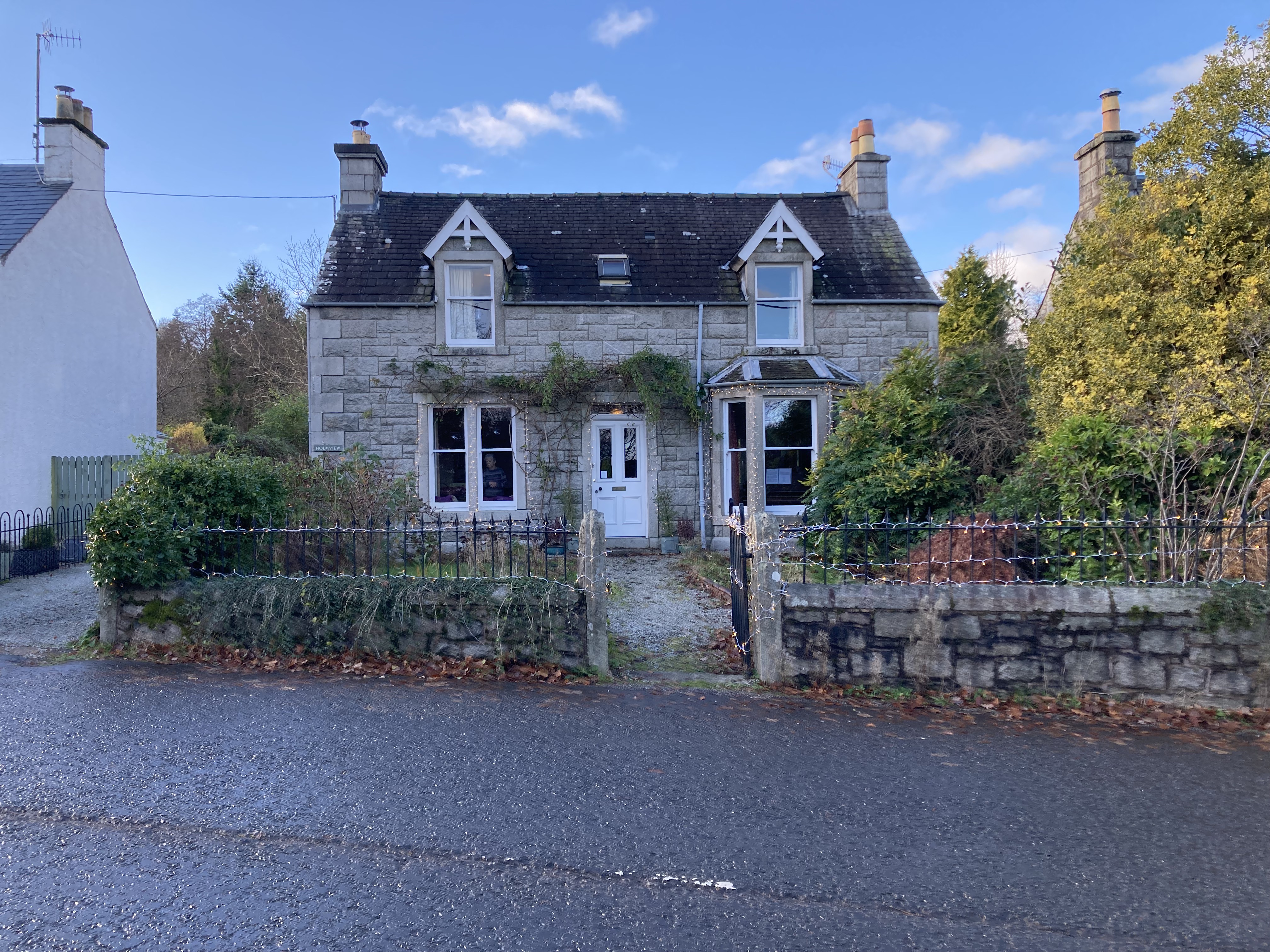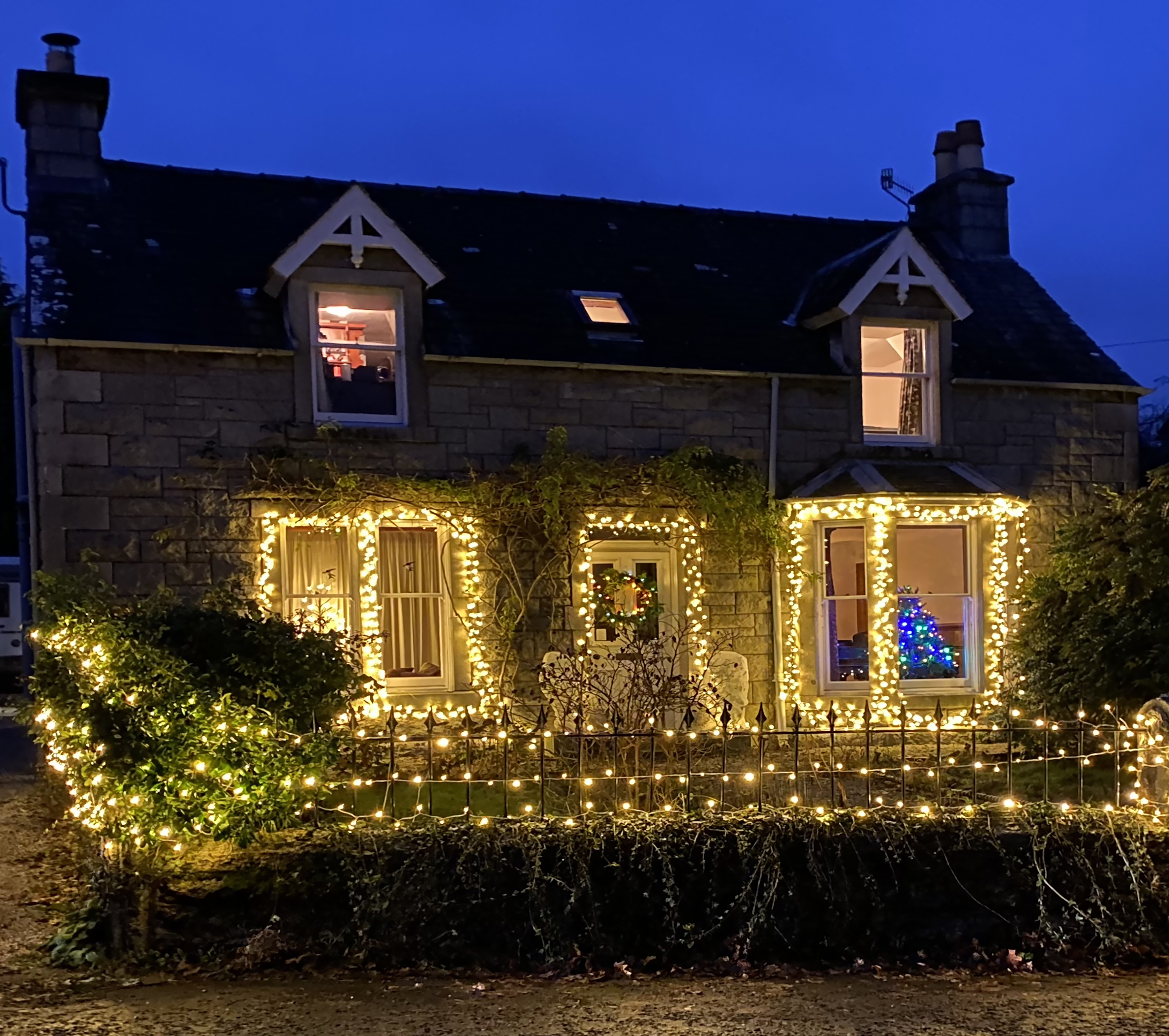 Villagers apparently gather at the Golf Clubhouse, two doors on beyond us, for a warming cup of hot chocolate, before the piper blows up his bag and all manner of banshees are let loose. At some safe distance, protecting our ears then, everyone in the assemblage is expected to follow the bagpipes on down the High Street to admire the seasonal lights all lit up at once for the first time.