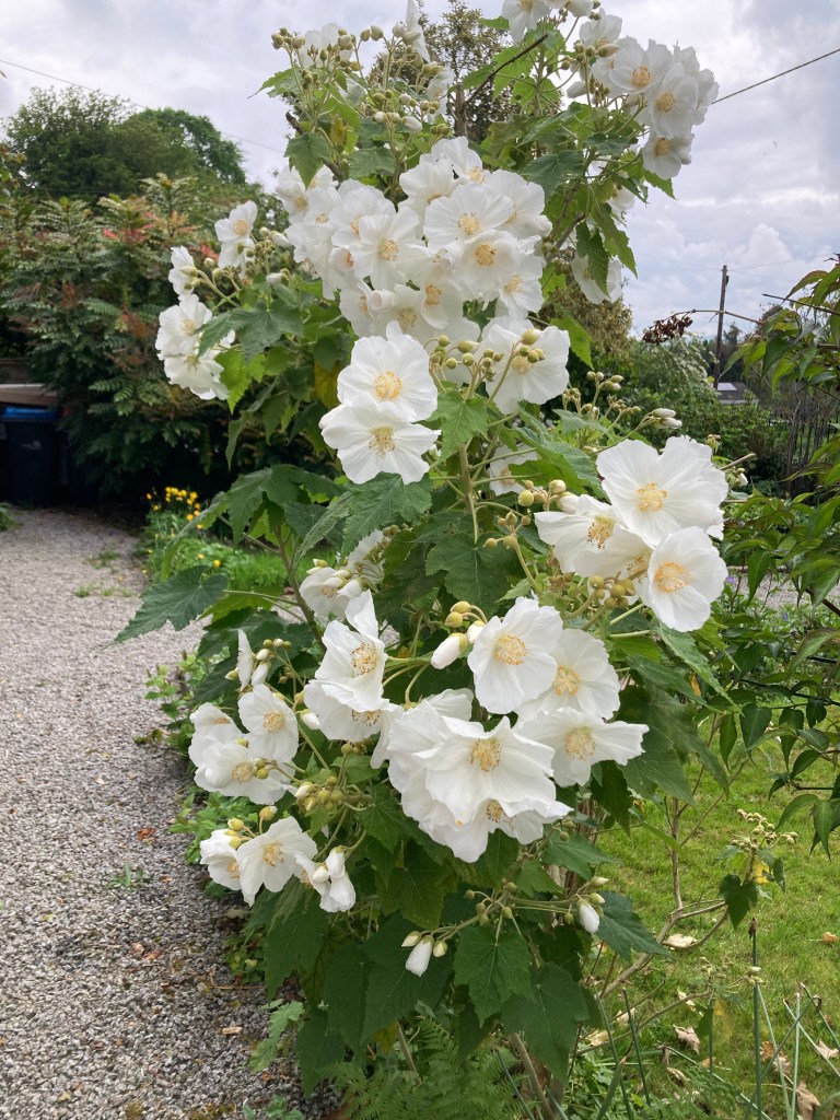 The incredible floribundance of the mallow in the front garden, pruned last autumn with what felt like devastating ruthlessness, has given way in our amazement to the solitary, somehow unfeasible blossom of a giant decorative onion in the back. How can it possibly sustain itself?