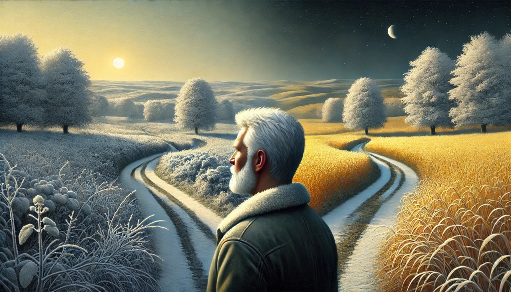 I love the shoulder-to-the-wheel structure of the daily grind, the routine, within which I can carve out characters, narrative, setting and theme. I hope to inhabit another novel, this year, I mean. The fields to the right of the dapper man in the ChatGPT-generated image above are full of a possible harvest. It’s exciting to me to think about the possible harvest I might glean through assiduous effort. Not in financial terms, though remuneration is always a delight if it arrives. No, this would be in self-fulfillment terms.