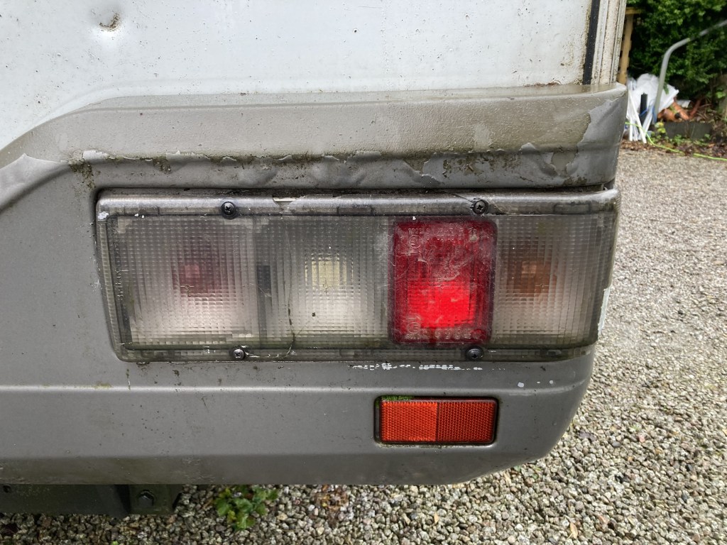 I know Harry’s been through the wars, and this particular side end has had an unfortunate encounter with our own little Fiat Panda as it scraped out around the corner into our drive. So the rear light panel had cracked and come off. I’d fastened it back with stout gaffer tape, but hadn’t checked the working tail lights. The brake light must have been damaged in the altercation.